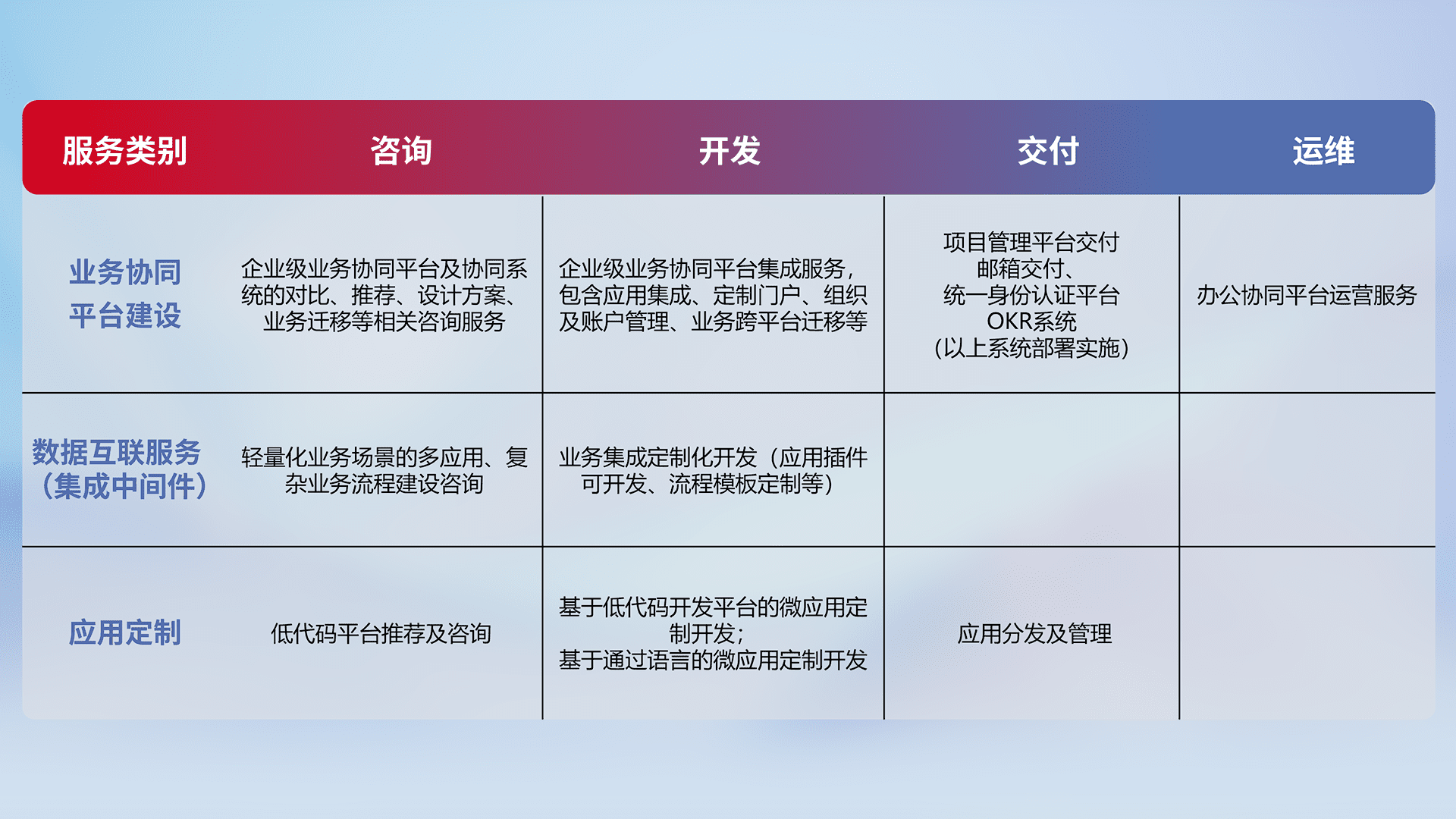 针对钉钉、、、、企微、、、IDaas等平台级产品提供产品的规划、、方案、、、、交付、、、定制化开发等服务,,实现如统一协同办公、、、、智能客户服务、、、、混合会议管理、、智能数据查询、、、等业务场景,,,,实现数字化转型。。